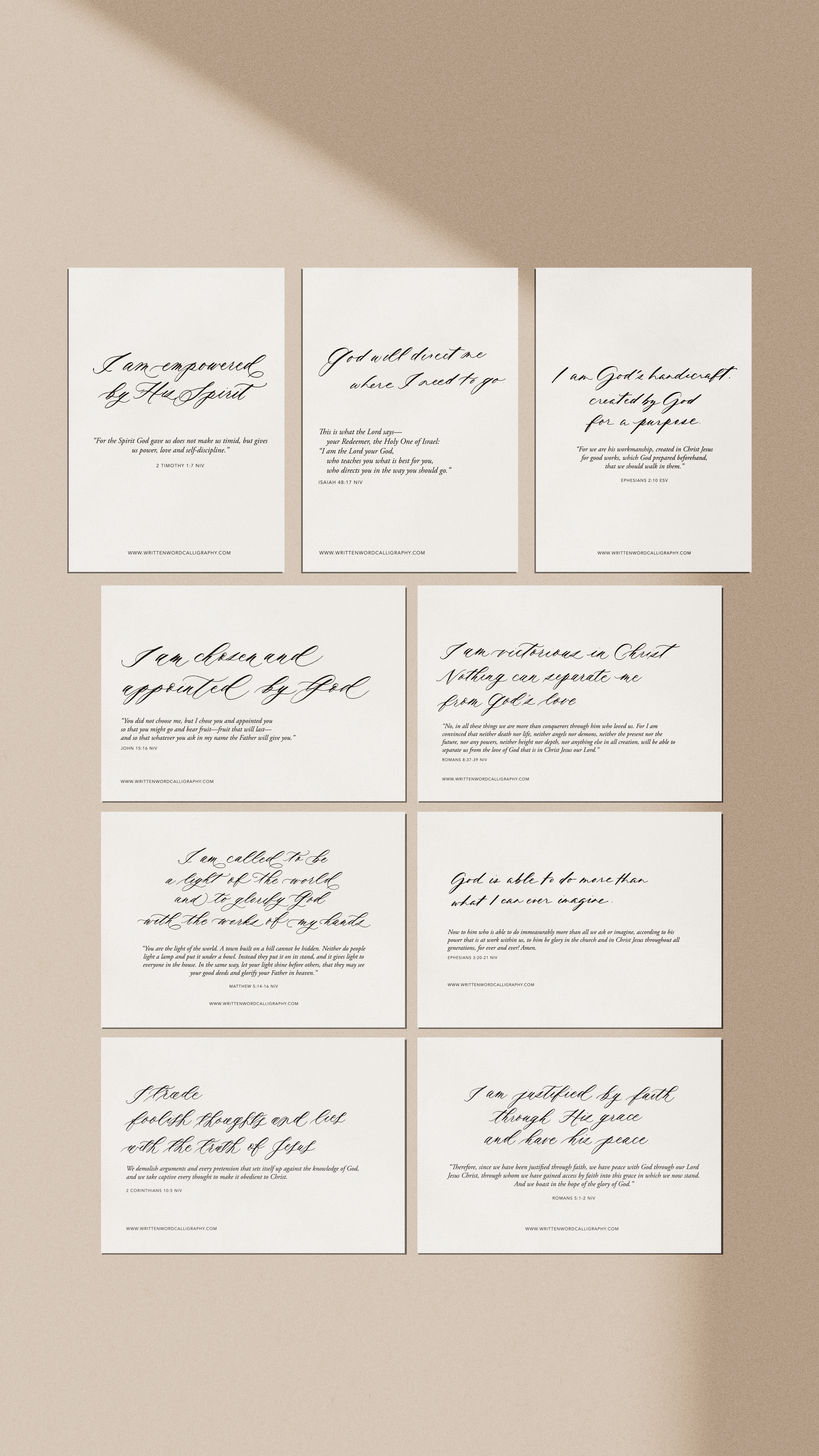 Digital Download of affirmations and Bible Verses written in various Written Word Calligraphy styles, to be cut into 5x7 sheets from 8.5x11 papers. In this printable, it will have the affirmation written in calligraphy, then the supporting Bible Verse in text form.