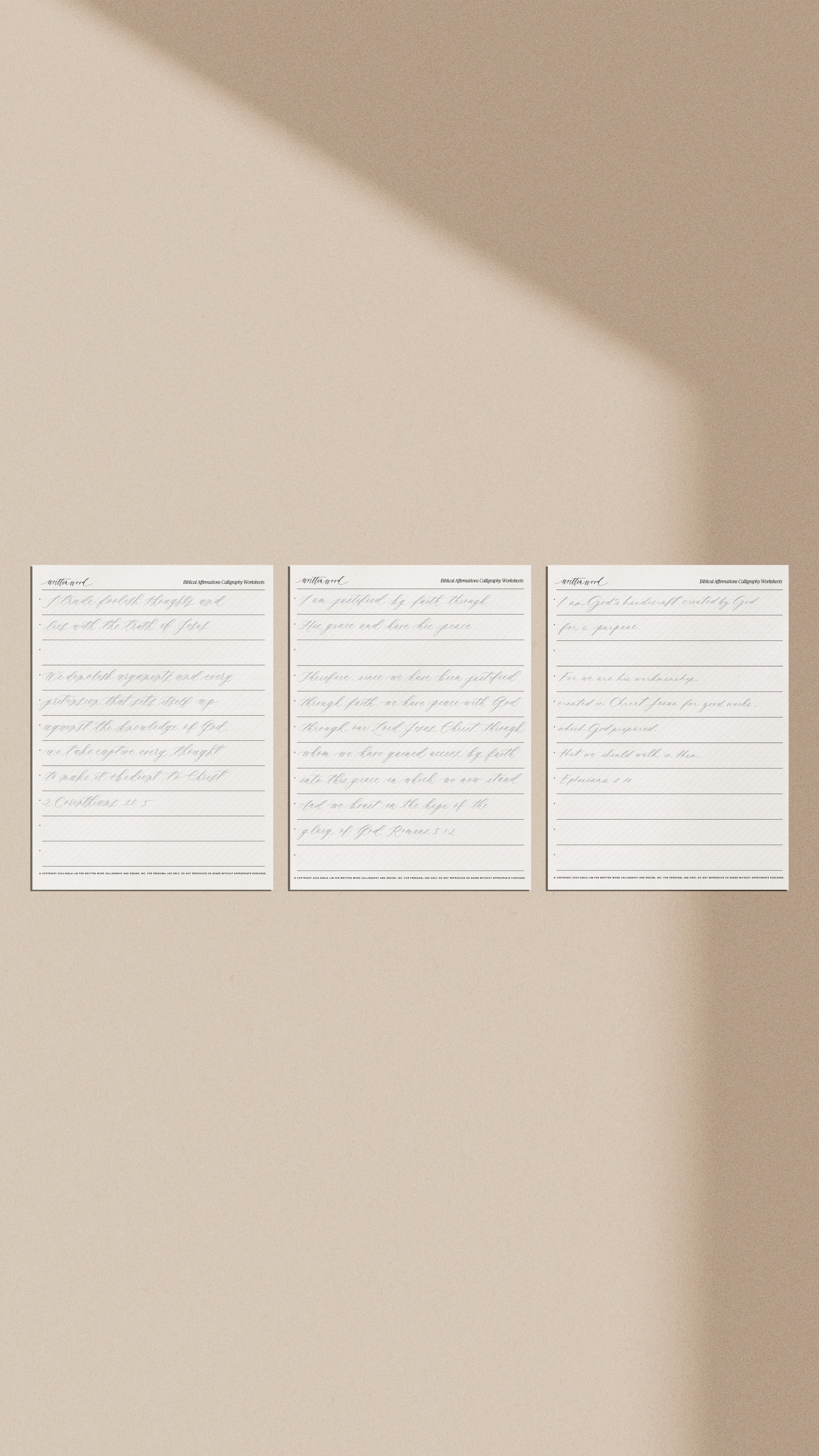 The worksheets feature an instruction guide, 18 Affirmations with the supporting Bible Verses on 8.5x11 sheets with tracing and slant lines, and the same verses in images to be used on Procreate on the iPad. The intention of these worksheets are for practicing to increase muscle memory for writing in calligraphy. An added bonus is that this is an amazing way to relax and meditate on God’s word while practicing, and also hopefully provide you some hope as you struggle through anxiety. Calligraphy supplies are not included in this digital file.