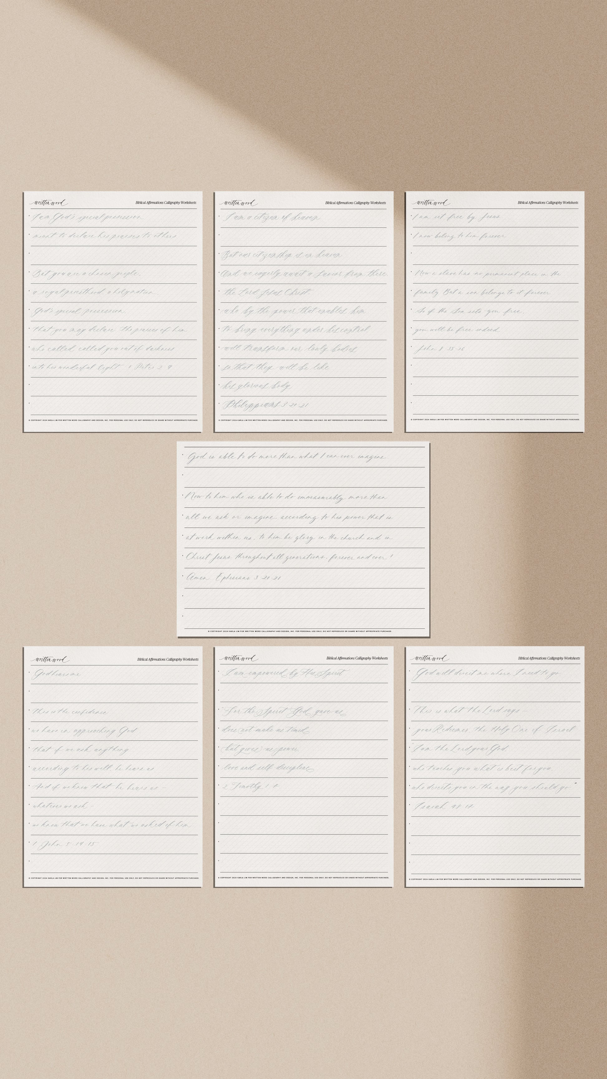 Digital Download of calligraphy verses written in various Written Word Calligraphy styles. In the worksheets, you will be practicing writing a collection of verses that affirming our identity in Christ, and how He is actively involved in our lives. After hearing so many self-focused affirmations, I knew in my heart I wouldn't be able to trust in myself - I would rather put my trust in He who is able to do beyond what I can ever ask or imagine. I also put together this Spotify playlist with worship songs that reflect the beauty and strength of these scriptures. Put them on and write with me.