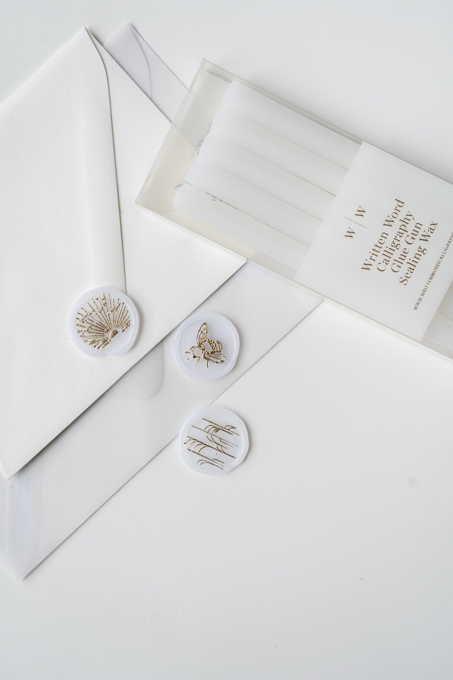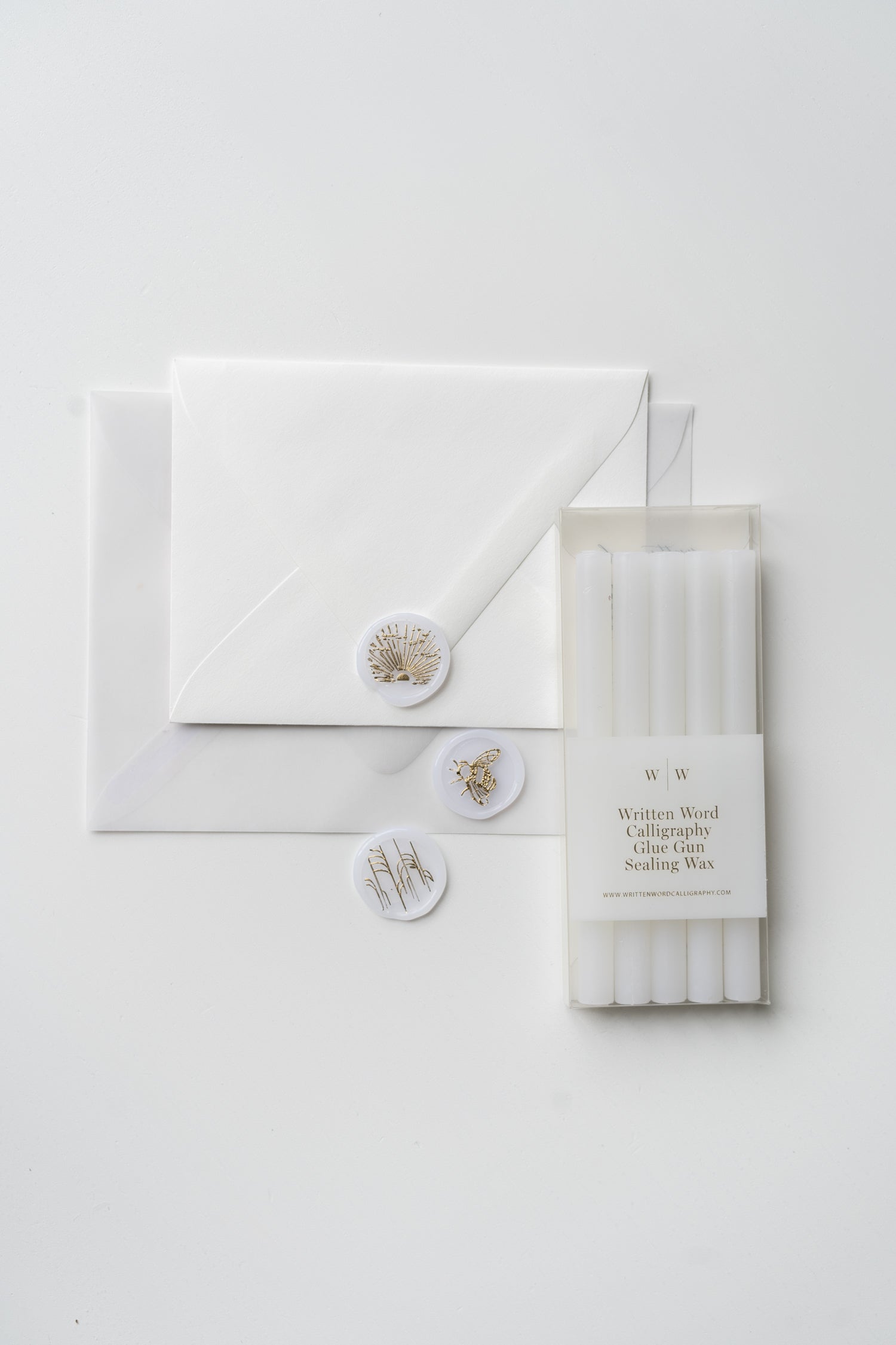 We love creating wax seals but using a wax stick can be quite tedious. Using a regular-sized glue gun will help dispense the wax a lot easier and safer! It will also avoid adding burnt swirls into your resulting seals. The stunning semi-transparent look also works great with adding dried flowers or gold accents!